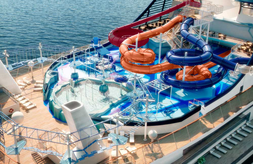 船上還有一個樂園和水上公園,令人驚嘆的全景區域以及兩條被LED電子屏覆蓋的漫步長廊。