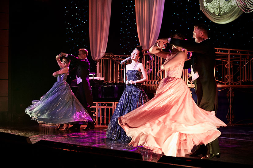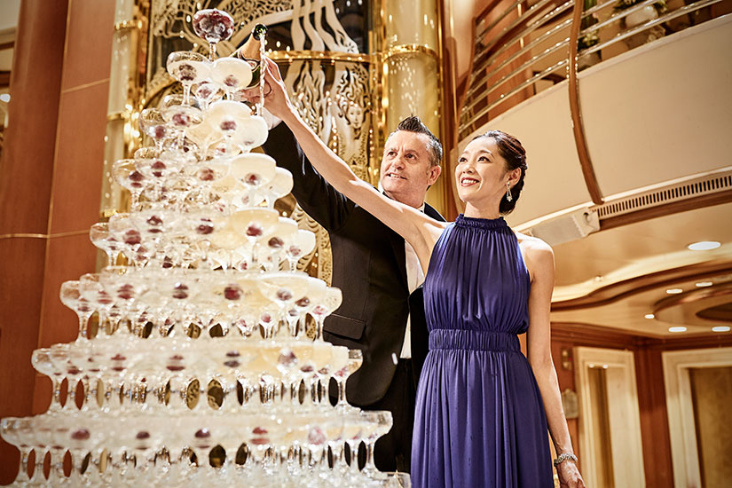 「香檳瀑布晚會」是遊輪上的重頭戲,乘客最好盛裝出席,每人皆有機會從堆疊成的兩百多個香檳杯尖塔上淋灌香檳而下,有專人協助拍照,最後還能得到免費香檳一杯,為此趟旅遊留下難忘回憶。